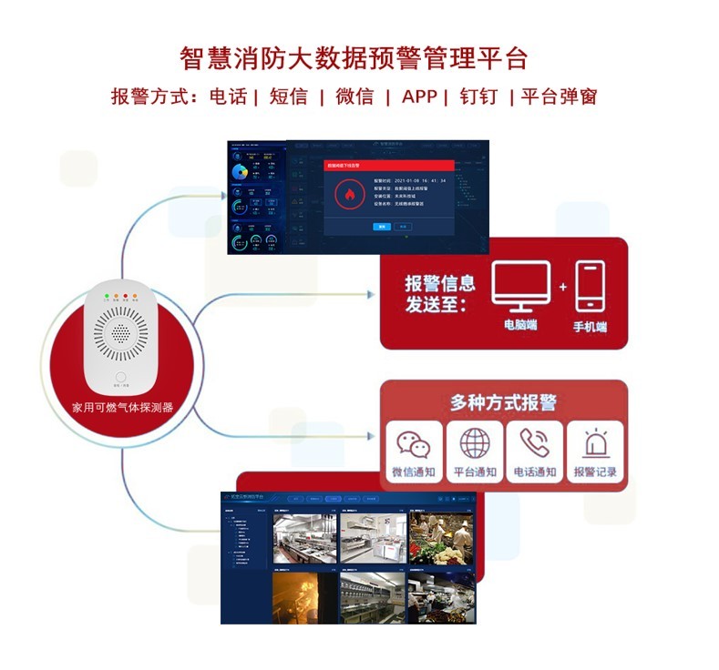 探測可燃?xì)怏w(一氧化碳);實時設(shè)備狀態(tài)監(jiān)測,及時發(fā)現(xiàn)設(shè)備故障;多種報警方式(短信、微信、平臺、電話等);1個接口可控制燃?xì)饩o急切斷閥;1個接口可控制排風(fēng)扇;簡易壁掛式安裝,簡單方便。